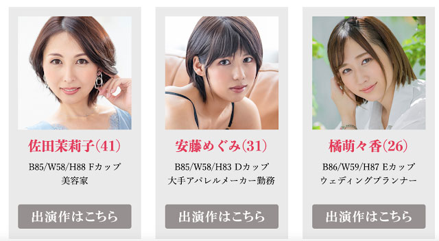 这三人当然是特别挑选出来的,首先登场是佐田茉莉子是四十路的熟女,再来出道的橘萌々香(橘萌萌香)年纪最轻只有26岁,而最后现身的安藤めぐみ(安藤惠)则是刚过三十大关的都会女星;三个不同世代的女星放在同一家公司,很明显地,SOD集团一定是想说些什么⋯