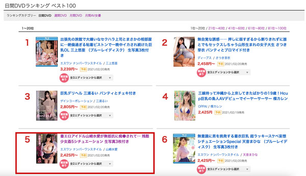 坦白说,她是有可能6支作品就不见的,因为她没有twitter和IG,这种女星向来不能保证待多久,像河北彩花这么杀也就是6片;但如果你说S1是用「踢」的请她走那是绝对不正确,因为身为S1到目前为止的最后一位新人(2020.12~2021.2这公司都没有新人),写真资历丰富的她打从一出道到现在都很卖,不只修改过的2020年销售排行榜把她的出道作列为第一,最新的作品「着エロアイドル山崎水爱が无抵抗に痴汉されて… 残酷少女姦5シチュエーション」在上架的前两天也通通进入单日销售排行的前10名,在S1只输三上,厉害的呢。