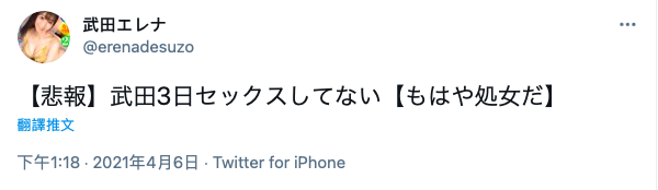 因为她发文的内容实在很猛,大家可以看看她昨天发了什么ー没有宣传自己解禁肛肛好的作品,而是悲伤地宣布自己3天没爱爱了ー没错,人家冲人气是放美美的照片开直播聊天,武田エレナ(武田绘玲奈)是每天和大家报告自己做了什么,像4月2日她就说自己自爽了4次〜