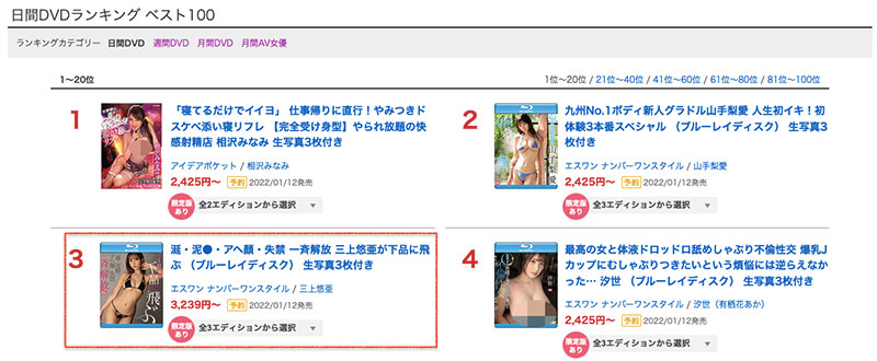 喜不喜欢女星外型、欣不欣赏她们的片子是很直接的感觉,但对公司而言只要会卖就是好作品,而销售排名就是最好的验收方式ー上次有说了,身为公认的天下第一人,三上悠亜厉害的是她打遍天下几乎没有对手的社群经营能力,但销售嘛⋯在月初更新的11月排行榜她双双跌出前十(DVD销售及所有作品累积销售),对一般专属女星来说还是不差,但她可是业界片酬的天花板三上悠亜,这样的成绩恐怕会让公司皱眉头: