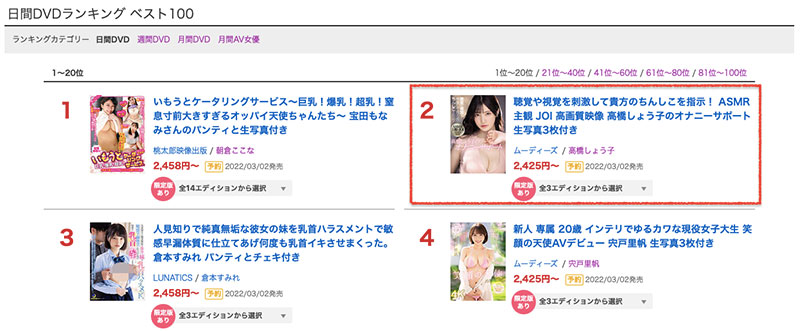还好,虽然没有拿下昨天的第一,但至少还是第二,也还OK,而随着2022年的到来,相信大家都看到高桥所属的公司Moodyz近来是专属女星连发,从“新一代美少女”石川澪开始、包括“一万人追踪就出道”花芽ありす(花芽有朱)、“神球”明日见未来、“写真明星”三田サクラ(三田樱)、“只被插入0.5公分”的佐久良咲希以及才刚出道宍戸里帆个个都是强者,这也让人不禁担心是否高桥しょう子(高桥圣子)共主的地位不再?