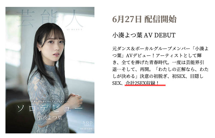第一支作品名为「小凑よつ叶 暗黑 DEBUT」,6月27日提供下载ー不知道是不是看到之前几位大物操作失灵的惨状,虽然SOD Star还是藏、还是要挤牙膏的方式没有一次把所有资料丢出来,但这家很会炒作新人的厂商还是在作品说明的地方注明这是一支「只有」2SEX、也就是比一般新人少一次完整星交演出的作品⋯