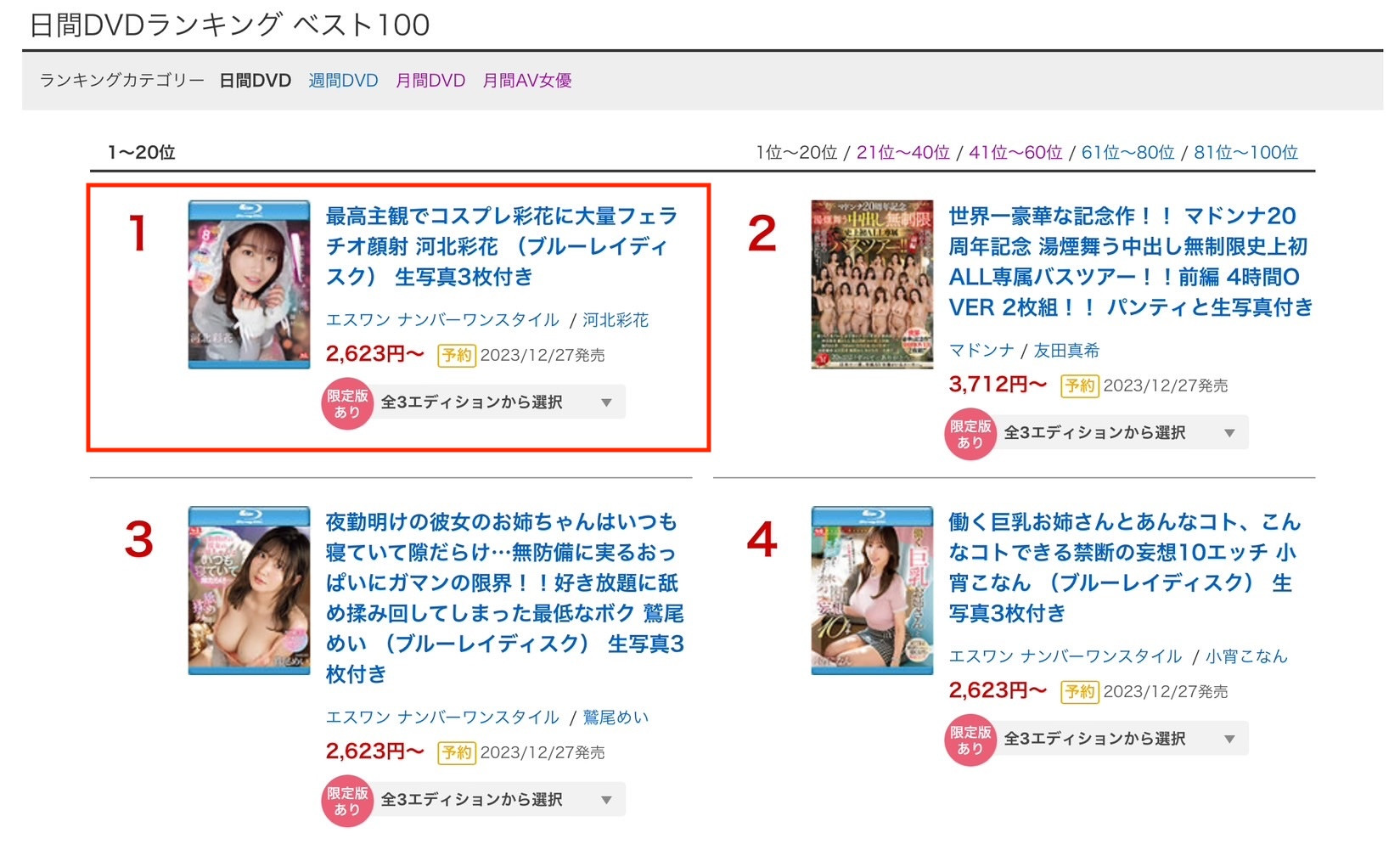 不过坦白说啦,这支作品还是很河北彩花,漂亮是很漂亮,不过如果你期待的是剧情片或是互动非常激烈的动作片那很抱歉河北是没有办法满足你的ー你说日本影迷看不腻吗?从她又一次拿到单日销售第一的情况来看很多人真的是因为这是河北彩花然后又有生写真特典可拿就预约了: