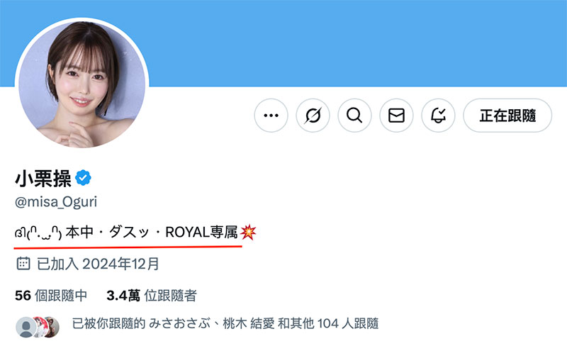 所以一家公司是不能满足她的,小栗操在X的自我介绍栏说了,她是本中、ダスッ!(DAS)以及ROYAL三家公司的专属,也因为同时有这么多公司看上她所以这个专属应该会做好一段时间,重启暗黑生涯有个好的开始⋯