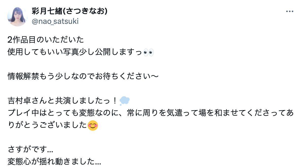 所以吉村大叔又吃到好粿了,从宣传影片可以看到他非常努力,不只用力舔拼命亲然后自创的吉村式体位连发,最后发射时的嘶吼声也听得出是有感情的,让号称是「人生第一次被男人里出」的彩月七绪爽到骨子里,说无套的男星让她快乐似神仙~既然彩月七绪本人说舒服,那SOD Star当然要继续追击下去,接下来上场的男星先是各种挑逗但说什么就是不插,让饥渴到不行的彩月七绪从猎物变成了猎人,扑倒男星后主动用女上男下的骑乘位处理,没多久就喷水喷了一堆鸡汤出来;最后就是男星二打一的3P连续里出,从这里又可以看出SOD Star对彩月七绪真的是另眼相看:一来是这种里出解禁的作品大多数的女星是拍四段、而彩月七绪只拍了三段;二来是现在这一行的里出解禁在最后一段乱搞时已经很少公司只用两个男星玩3P了,这明显是手下留情了: