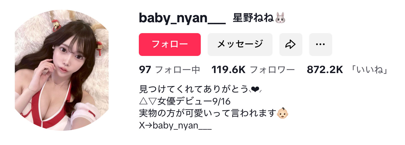 因为怕你不信,所以公司附上了她的Tiktok帐号(),确实是个接近12万追踪的网红,而且还很贴心地附上了艺名ー没错,她叫做星野ねね(星野宁宁),虽然透过这个艺名你还可以找到她的X和IG,虽然追踪没有TIktok多,不过从上传的自拍照和短影音来看她就是个标准的网红脸,而且,身材还不错呢: