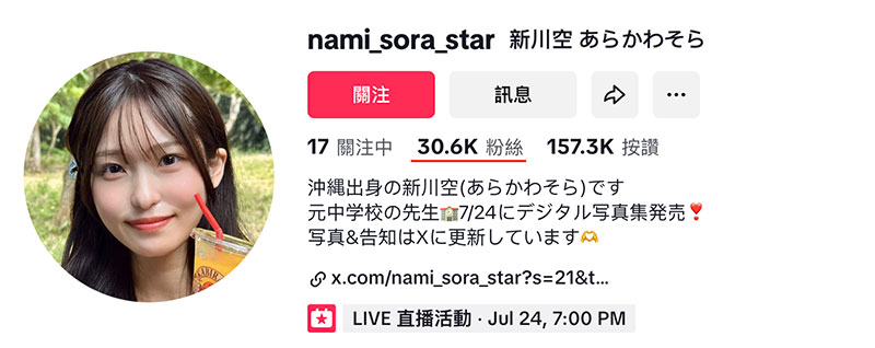 那是因为这位新人在正式成为暗黑女星之前就已经启动她的社群,Tiktok()已经有超过3万粉丝了;至于X,虽然3月创的帐号()到现在「只有」6000多人追踪,但从新川空的发文就知道她已经有写真集问世,所以ー