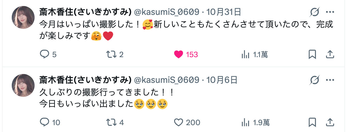 之所以这么说是因为斎木香住(斋木香住)在X()上更新的消息:她是个蛮有趣的女星,在暂停发片的时候她几乎没在更新社群,但她有提到两件重大讯息,一个是在KANBi的片子发完后她今年不会再有作品了,第二个则是「10月拍了很多作品」: